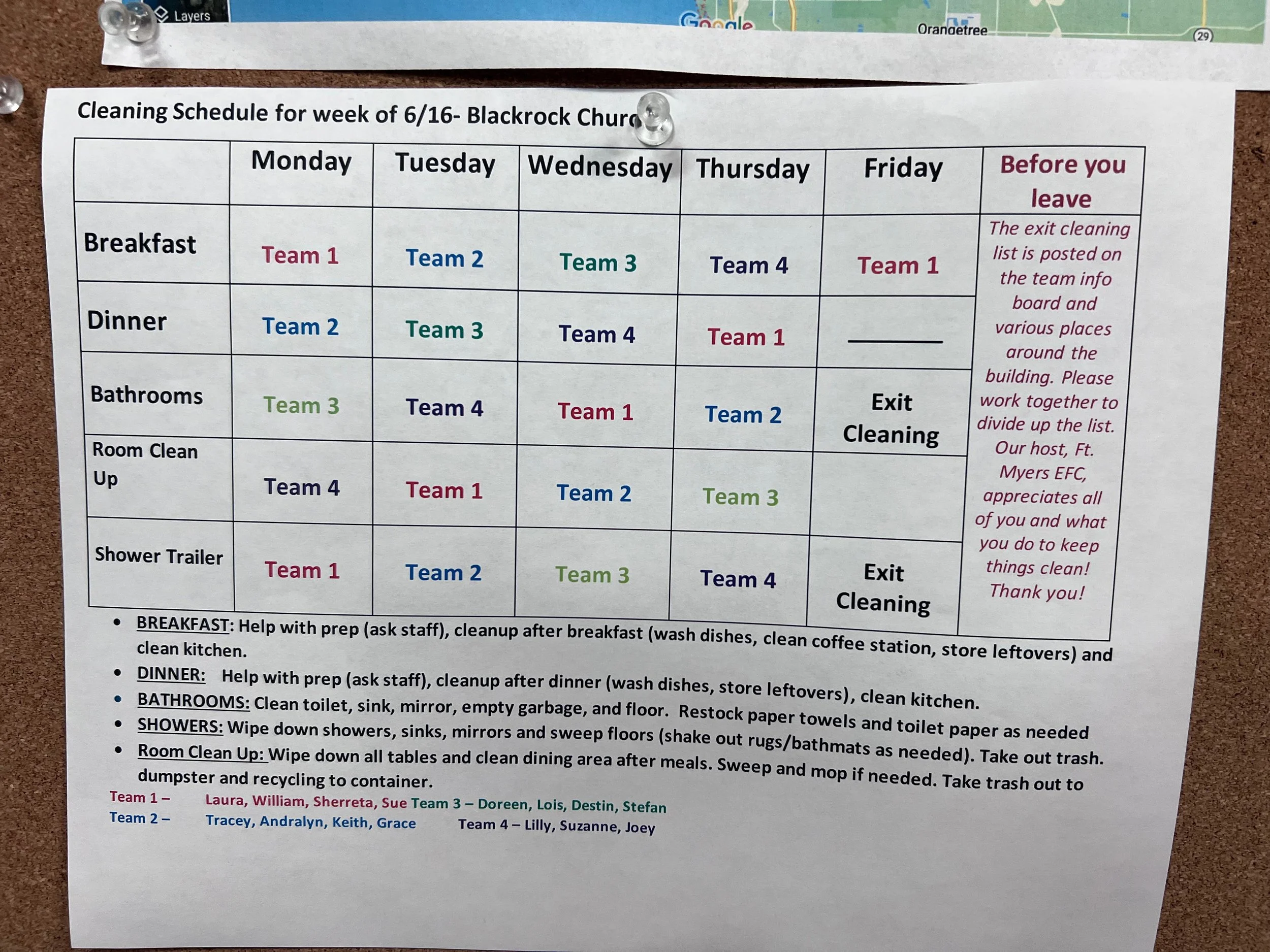 Clean up schedule for the green shirt team from Black Rock church.