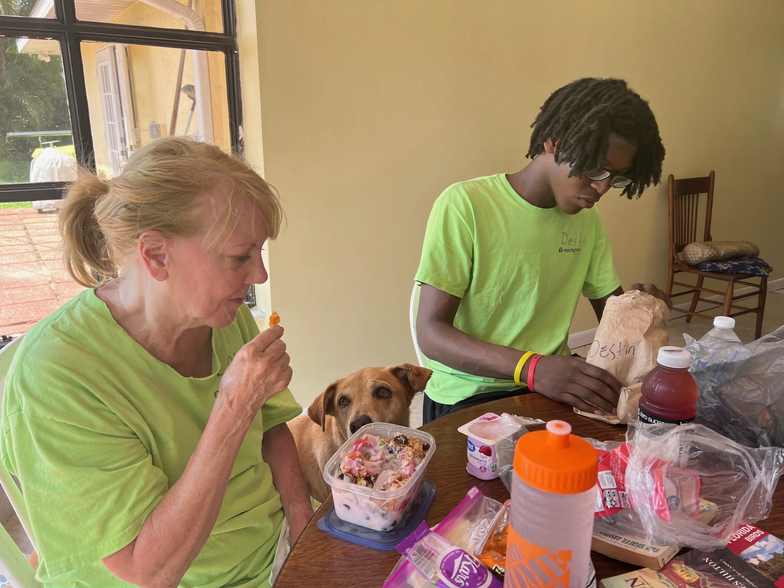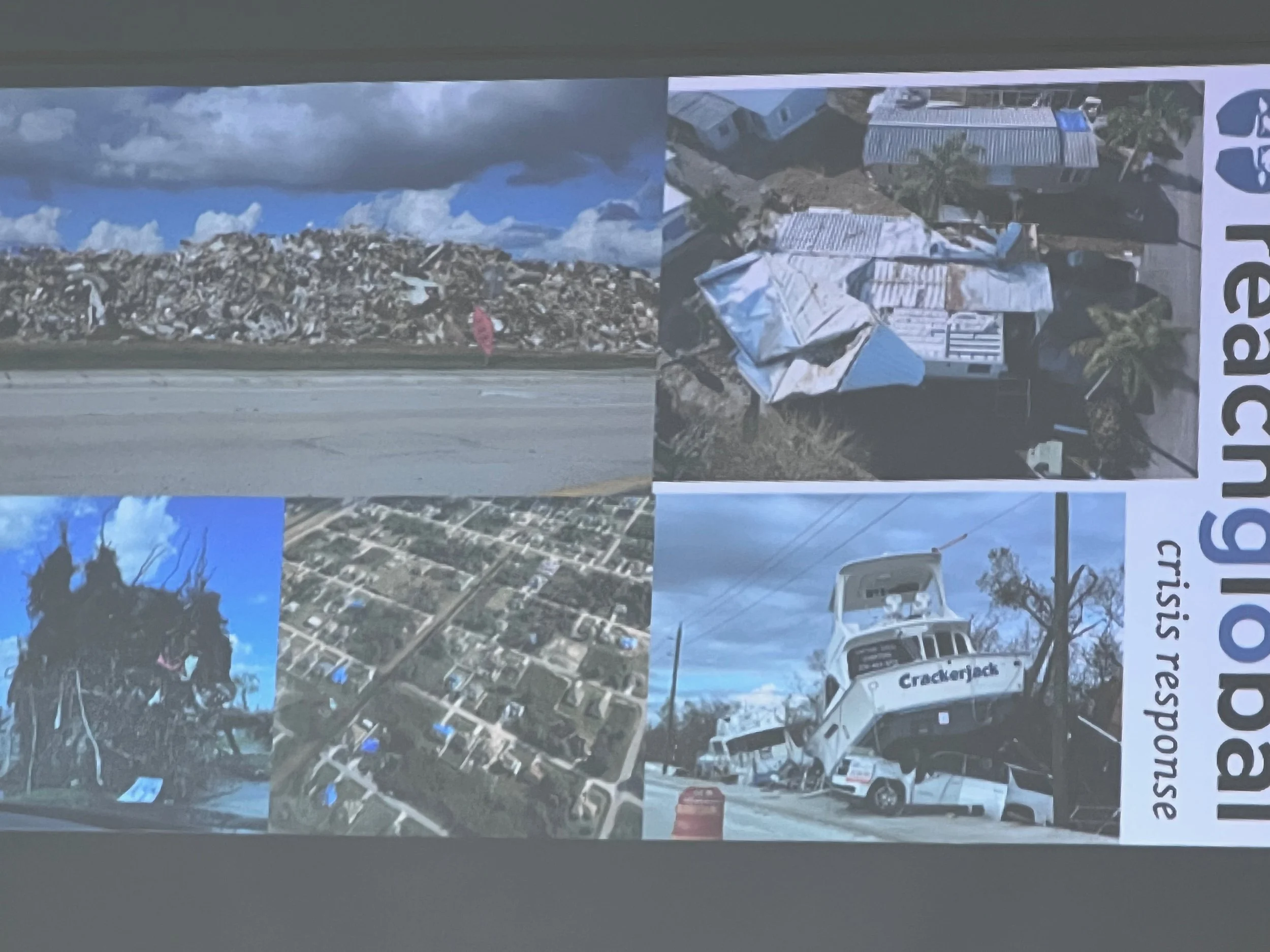 The trip was ultimately organized by Reach Global, which is the missions organization of the Evangelical Free Church of America, but more particularly the “Crisis Response” unit of that world wide organization. The Crisis Response unit (blue shirts in the above photo) consists of people (typically retirees and young people taking a gap year between high school and college) who raise financial support so they can live (typically in trailers) at crisis centers any where from 2-5 years. When the crisis is finally over in one location, they raise funds so they can move to the next one. The blue shirt couple that helped us at our site (Steve and Susan, 4th from left back row, and third from left front row) had been for years in a site in Texas and are now in the process of raising financial support so they can settle at Fort Myers for the next few years, assisting volunteers like our group (the green shirts) who come down typically for a week to help. The blue shirts said that they are not usually the first people on location after a crisis, but they are often the last to leave. We all left with a great deal of admiration for these people working in the name of Jesus to care for others in need.